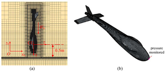During the CFD simulation, a rectangular computational domain region of 12L × 10L × 5L is selected, as shown in Figure 5a. Due to the symmetry of the flow field, a symmetric surface treatment is applied for the computational domain. The vehicle surface is defined as moving walls with certain velocities. For inlet, the velocity inlet boundary is set with a specification of inlet velocity magnitude and specified at 4L upstream of the vehicle. The pressure outlet with specified pressure is specified at 8L downstream of the vehicle. After the vehicle model is released, it falls freely due to Earth’s gravity with an initial velocity. The water depth is set as 6L, and the initial height of the vehicle is specified as 0.5 m above the mean water. The y+ values should be larger than 30 to ensure accuracy for the SST k-ω model [36].