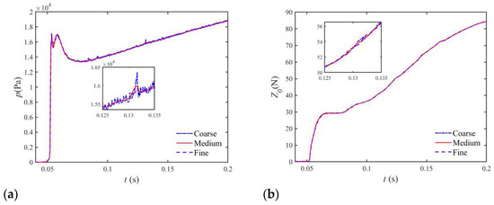 Convergent analysis of the time history curves of (a) pressure at the fore; (b) vertical force for the water entry of UAUV with different mesh systems.