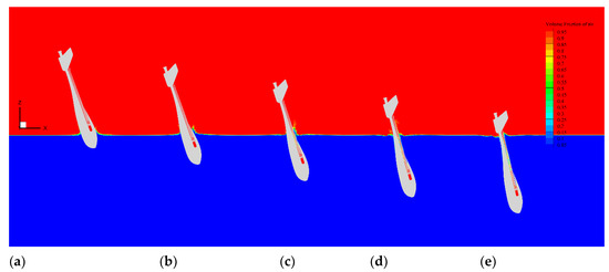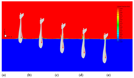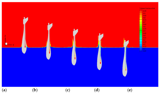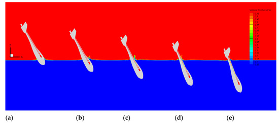 Free surface profiles of the UAUV entering water at Ws = 12.0 m/s at different times: (a) t = 0.04 s, (b) t = 0.06 s, (c) t = 0.08 s, (d) t = 0.08 s, and (e) t = 0.12 s.