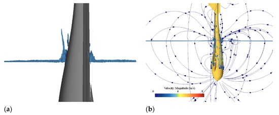 Figure 10a shows the jet flow around the intersection area between the water and the vehicle. The flow separation depends on the Froude number and the shape of body (Gurevich [38]). In some cases, the water would separate from the body in the absence of fluid gravity, and the water would break up into spray, as shown in Figure 10a. Streamlines around and velocity magnitude distributions at t = 0.15 s are shown in Figure 10b. Because of gravity, the fluid particles attached to the body surface were pulled down eventually, and the attached water could not be sustained indefinitely. Fluid/structure interaction may also make the flow more turbulent.