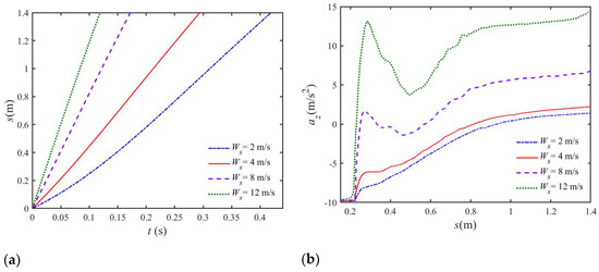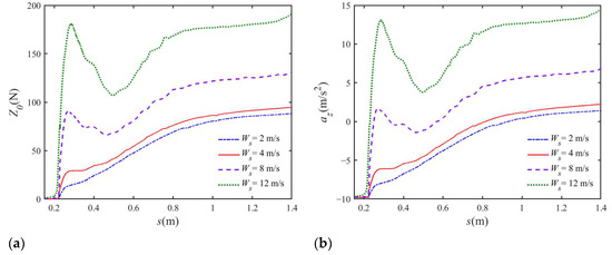 The characteristics of the predicted vertical velocity, acceleration, and hydrodynamic force are analyzed against a submergence parameter s. The depths curves of the vertical translation s and vertical velocity (in the Earth-fixed coordinate) are given in Figure 11a,b. While impacting the water, the vehicle decelerates due to the slamming force exerted on it. Through the comparison of different Ws, it was found that vertical translation varies faster with larger vertical velocity.