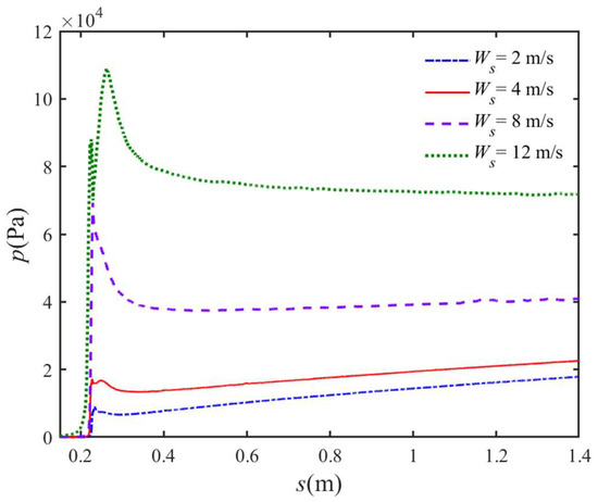 For a vehicle with a smooth fore, the stagnation point is near the fore and may move toward the upstream direction. According to Bernoulli’s equation, the fore of the vehicle is generally exposed to the pressure peak, which can be taken into consideration. Therefore, the maximum pressure at the fore of the vehicle is defined as a representative pressure, as shown in Figure 6b. In the simulations, the vertically deposited UAUV with initial pitch angle θ0 = 90° falls freely and vertically with Ws = 4.0 m/s, where Ws is the initial vertical water-entry velocity in the Earth-fixed coordinate. For the vertical water-entry problem, the vertical velocity W equals the transverse velocity u in the body-fixed coordinate.