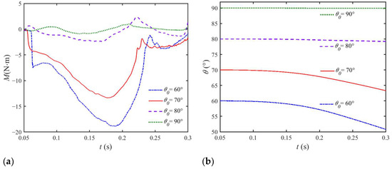 Comparison of time history curve of (a) moment and (b) pitch angle for the water entry of UAUV with different initial pitch angles.