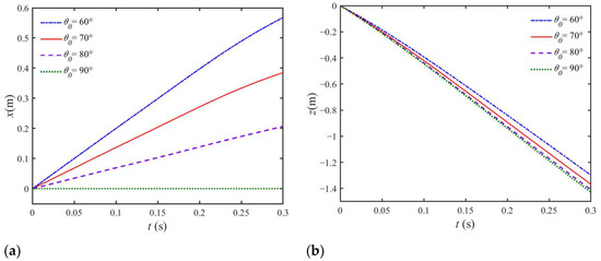 Figure 18a and Figure 18b, respectively, give the time-varying moment and pitch angle of the vehicle. The net rotation of the vehicle with θ0 = 60°and 70° is much larger than the other two cases, as shown in Figure 18b. The initial pitch angle affects the horizontal translation and rotation of the vehicle as it enters the water for a longer time. A larger righting moment exerted on the vehicle accelerates its rotation and restores its orientation. Figure 19a and Figure 19b, respectively, gives the horizontal and vertical translation of the vehicle with different initial pitch angles. With time, the vehicle penetrates the water surface gradually. Transverse resistance is also exerted on the vehicle, which results in horizontal translation. The trajectories depend on both the direction of velocity and the inclination state. In Figure 19b, the curve of θ0 = 80° is close to the reference case of vertical water entry.