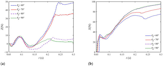 Except for vertical water entry, it is of extensive interest to simulate the oblique water entry of a body with an initial pitch angle. As an important physical parameter, the difference of a vehicle’s inclination has a significant influence on the media crossing motion. The water-entry velocity is us = 4.0 m/s, and the initial pitch angles θ0 are 90° (reference case), 80°, 70°, and 60°, while holding other variables the same. The direction of initial water-entry velocity us is along the axis of the vehicle as shown in Figure 14a. Here, angle of inclination (AOI) is defined as the complementary angles of the pitch angles, which are 0°, 10°, 20°, and 30°, correspondingly. In this section, further results on horizontal motion and hydrodynamic force will be discussed.