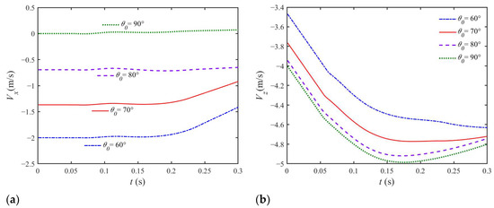 Comparison of time history curve of (a) horizontal velocity and (b) vertical velocity for the water entry of UAUV with different initial pitch angles.