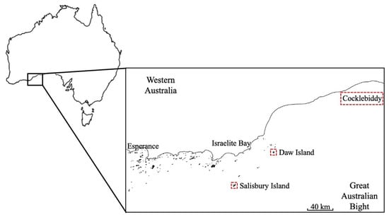 Presently, there are two known C. carcharias subpopulations in Australia: (1) the Eastern Australian subpopulation [25,26] and (2) the Southern-Western Australian subpopulation [9]. In relation to the Eastern Australian subpopulation, two C. carcharias nursery areas have been identified (i.e., Corner Inlet and Port Stephens) [10,11]. However, although research has been conducted in relation to the Southern-Western Australian C. carcharias subpopulation [9,16], insufficient data have been provided that confirms the discrete location(s) of a C. carcharias nursery area [27,28]. More specifically, Bruce (2016) suggested that the nursery areas associated with this subpopulation may not be discrete but rather extend over broad regions within the continental shelf. Given the lack of data in relation to the potential nursery areas associated with the Southern-Western Australian C. carcharias subpopulation and to aid in the biological understanding of this species, the present study describes the opportunistic data collected through various sources (e.g., BRUVS, stereo- and laser-photogrammetry, and anecdotal commercial fishing data) from two different regions (a) the Recherche Archipelago, Western Australia, and (b) a commercial fishing site near Cocklebiddy (Figure 1), Western Australia, to help identify two high priority regions that may represent discrete nursery areas or parts of a broad and interconnected nursery as suggested by Bruce (2016).