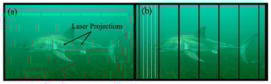 Laser photogrammetry image captured by the laser-equipped Blue Robotics Underwater remote operated vehicle (BlueROV2) of an early-stage juvenile white shark (Carcharodon carcharias) at Daw Island in March 2021. (a) The parallel laser projections can be seen on the flank of the shark. (b) This image was then rescaled to fit a measurement template (i.e., black vertical lines with each space representing 0.33 m and white vertical lines representing 6.6 cm) allowing the determination of this shark’s total length of 1.85 m.