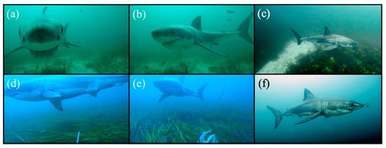 Examples of young-of-the-year (YOY) and juvenile white shark (Carcharodon carcharias) interactions on the baited remote underwater video systems (BRUVS; a–e) and the BlueROV2 (c,f). These images were captured at Daw Island, Western Australia—33°51′ S, 124°08′ E.