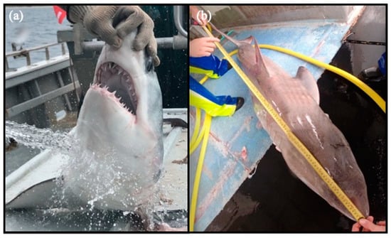 Examples of white shark (Carcharodon carcharias) bycatch associated with a commercial fishery operation at a site near Cocklebiddy, Western Australia; 32°16′ S, 126°17′ E). (a) A 1.40 m total length (TL) C. carcharias female captured in 2020. (b) A 1.70 m TL C. carcharias female captured in 2020.