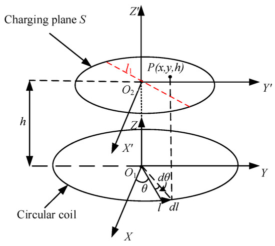 Suppose that the radius of a single-turn circular Tx coil is a; simultaneously, the receiver (Rx) coil is located in the circular charging plane S at the gap of h, and the radius of the S-plane is greater than the radius of the Rx coil, as shown in Figure 1.