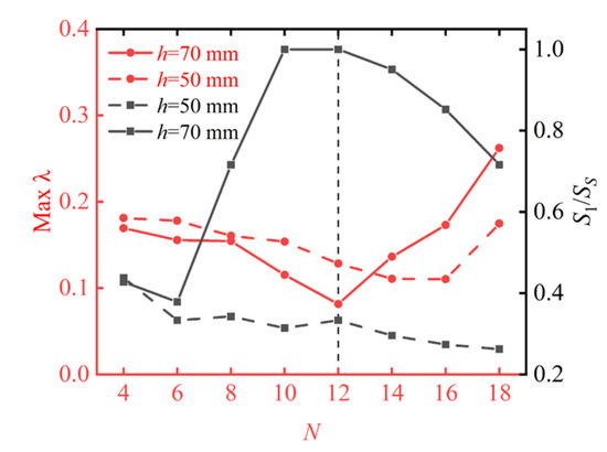 When the outer diameter of the Tx coil is determined, the average radius of the coil decreases as the turn numbers of the coil increase. In addition, the distribution of BZ calculated by Equation (1) ignores the single-turn coil thickness, and the results may differ from the actual value. By using COMSOL simulation software, the influence of different circular coil turn numbers on the BZ distribution in the S-plane can be more accurately analyzed. The maximum discretization of BZ and the ratio of UMF area to the total area of the S-plane with h = 50 mm and h = 70 mm under different coil turn numbers are shown in Figure 4.