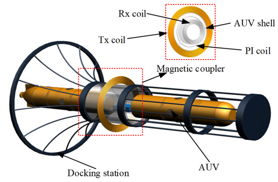 The magnetic coupler is the key component that determines the performance of a WPT system, including output power, power transfer efficiency, misalignment tolerance, and electromagnetic compatibility. Various magnetic couplers for AUVs with different structures have been studied [6,7,8,9,10,11,12,13]. A three-phase WPT system for a lightweight AUV was proposed in [6], which enhanced the system’s misalignment tolerance to rotational offsets, but the axial and radial misalignments were not considered. Wu et al. [7] developed a magnetic coupler structure with a quadruple Tx coil and crossed dipole Rx coil to prevent rotational and axial misalignment. Zeng et al. [8] proposed a novel hybrid transmitter composed of conical and planar spiral coils. The experimental results showed that the proposed WPT system’s output power changes were within 5.7%, and the power transfer efficiency was maintained at approximately 86% in an excessive misalignment area with a transfer distance of 2 cm. A magnetic coupler structure with a spiral tube type is adopted in [10] to be compatible with the structure of AUV. In addition, Wang et al. [14] aimed at proposing an omnidirectional and positioning-tolerant planar-type AUV docking and charging platform, which has no constraints on AUV structures. However, two main shortcomings restricted their application—on the one hand, some couplers are unconsolidated and space-consuming; furthermore, some magnetic couplers are incompatible with an AUV’s hull, and modifications are inevitable, which have negative effects on the hydrodynamic or pressure-resistant performance of AUVs. On the other hand, in most couplers’ design procedures, radial, axial, and rotational misalignments, which may be caused by docking errors or ocean current impact, were not taken into consideration simultaneously.
