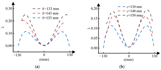 Since AUV needs to maintain a radial offset of at least 30 mm; in other words, the inner diameter of the PI coil should be greater than 130 mm, assuming c = 130 mm. Figure 7 shows the magnetic induction intensity distribution on line l1 varying with the size of the PI coil.