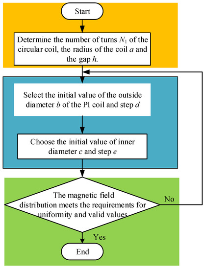The above discussion shows that the introduction of a PI coil can improve the uniformity of the induced magnetic field distribution. The values of parameters b and c that meet the requirements can be obtained through the flowchart shown in Figure 8.