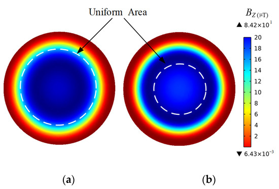 As can be seen from Figure 4, the distribution of BZ and the area of the UMF region at h = 70 mm is related to the turn numbers N of the circular coil. When N = 12, the distribution of BZ in the entire S-plane meets the conditions of a UMF; at the same time, the fluctuation of BZ is minimal. However, for h = 50 mm, as shown in Figure 4, by adjusting the turn numbers of the circular coil, the area of the UMF region S1 always stays at a low level. Some other methods need to be taken to increase the area of the UMF region when h = 50 mm.