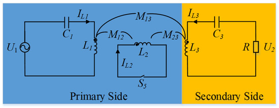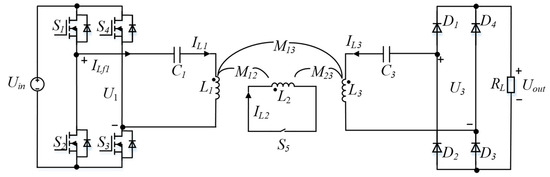 The proposed WPT system circuit structure with a PI coil is shown in Figure 10. The DC voltage Uin is converted to AC voltage U1 through a full-bridge inverter consisting of four MOSFETS (S1–S4). The power is transmitted from the primary side to the secondary side through the resonant network and electromagnetic coupling mechanism. C1 and C3 are the compensation capacitors. The electromagnetic coupling mechanism consists of Tx coil L1, Rx coil L3, and PI coil L2. M12, M13, and M23 represent the coupling between each coil, respectively. Switch S5 controls the switching of the PI coil. The DC voltage on load RL is obtained by the secondary side compensation network output voltage U3 through a rectifier consisting of four DIODES (D1–D4). Moreover, the S-S compensation topology has the characteristics of simple structure and high efficiency, which is suitable for underwater WPT applications with limited space.