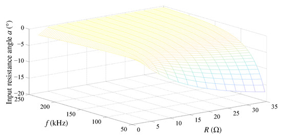 where α represents the input impedance angle. The addition of a PI coil brings an imaginary part to the input impedance, and ZPA can no longer be realized. As can be seen from (12), the input impedance angle α is related to the angular frequency ω, equivalent load R, the inductance of PI coil L2, and coupling between coils. M12, M23, and M13 are 1.9 µH, 0.1 µH, and 7.51 µH, respectively. With the calculation of MATLAB, the relationship among the input impedance angle α, load R and system frequency f is shown in Figure 12.