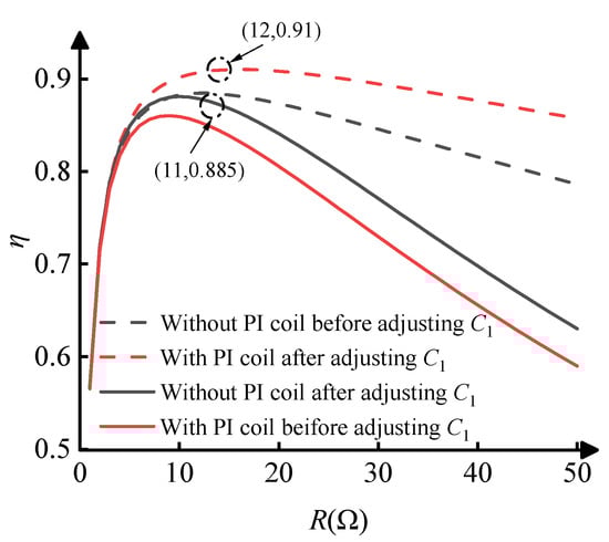 where R1, R2, and R3 are the parasitic resistance of L1, L2, and L3, respectively. The effect of load changes on power transfer efficiency is shown in Figure 14. It can be seen that when the load changes within 0~50 Ω, the power transfer efficiency of the WPT system after adding a PI coil and without a PI coil are consistent, both increase sharply at first, and then decrease slowly. Meanwhile, the introduction of a PI coil reduces the optimal efficiency of the system by about 3%.