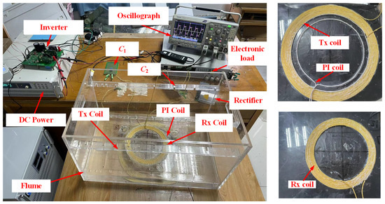 An experimental platform is built to verify the proposed structure, as shown in Figure 15. To reduce the skin and proximity effects, the Litz wires are employed for the construction of Tx, Rx, and PI coils. They are wound by AWG 38 litz wires with 400 strands. The structure of the Tx coil, Rx coil, and a PI coil are also shown in Figure 15. The water tank is built to realistically simulate the marine environment, and the gap between coils is filled by saltwater with a salinity of 4‰. The electronic load is used to simulate the load change in the WPT system. The parameters of the proposed WPT system are listed in Table 3.