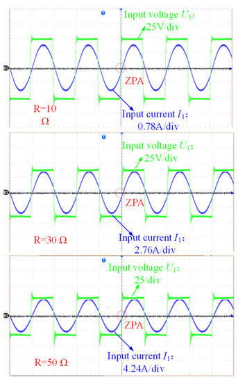 The ZPA characteristics of the system are verified by measuring the phase angle of the input voltage and current with an Oscilloscope. Considering that the internal resistance of the batteries does not change much during the charging process, the resistance of the electronic load gradually increases from 10 to 50 Ω. The experimental waveforms of input voltage and current are shown in Figure 16.