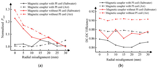 The introduction of the PI coil changes the output characteristic of the WPT system, and in order to compare the fluctuation of output power, the output power of the system is normalized, as shown in Figure 17. In addition, the comparison test of the proposed WPT system in air and saltwater is added to verify the function of the PI coil.