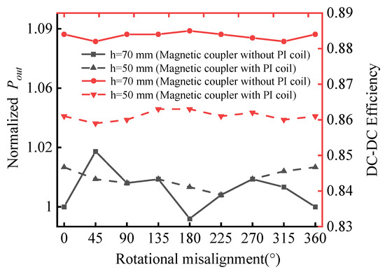 As can be seen from Figure 19, the output power and efficiency of the WPT system vary very little as the rotational degree changes. The introduction of a PI coil does not affect the good resistance to rotational misalignments of the circular coil.