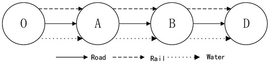 Since ST is an advanced form of multimodal transportation, the research on its related issues is usually based on the basic problems of general multimodal transportation. This study considers a multimodal transportation network problem, which can be described as follows: the carrier is responsible for transporting goods from the starting point O to destination D, and adopts a comprehensive transport network that combines multiple transport modes. The network is composed of m nodes (cities), which are connected by arcs. (Take nodes A and B for example.) Different arc types represent m transport modes. The network is described using the multiple edge method, as shown in Figure 1.
