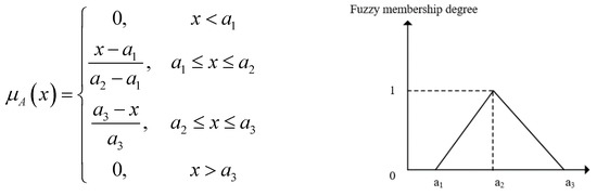 Due to the uncertainty of transportation time caused by train delays, traffic jams, weather changes, channel congestion, etc., when the distance is constant, the average transportation speed vj is considered an uncertain variable, and its determined value is often difficult to obtain accurately, but it is easier to obtain its approximate range. Therefore, it seems feasible to use triangular fuzzy numbers to represent the uncertain variable vj. Therefore, we define vj = (a1, a2, a3), and its membership function μA (x) can be expressed in the form of Figure 2.