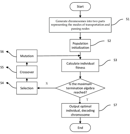 The path optimization problem in this paper belongs to the category of network paths. Network optimization itself is a combinatorial optimization problem and is also an NP-hard problem. There are many special algorithms to solve the network path optimization problem, each of which has its advantages and disadvantages in solving adaptive problems. As a combinatorial optimization problem, it usually has more local extremum points, and the local extremum is not necessarily the global optimal solution to the problem. In addition, for some large-scale problems, the search space of solutions is relatively large and difficult to solve. As a type of random search algorithm, the genetic algorithm (GA) has good performance in dealing with such problems [23]. GA selects all individuals in the population according to the relevant principles, calculates the selection probability based on the fitness function, forms new individuals through a series of individual crossovers and mutations, and finally converges to obtain the optimal solution. The operating process of GA is a typical iteration search process. For the multimodal transport path optimization problem discussed in this paper, the operation steps of GA can be described as follows, and the algorithm flow is shown in Figure 3. More details about the algorithm can be seen in Appendix A.