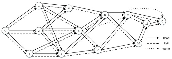 Multimodal transportation path optimization is a combinatorial optimization problem, which focuses on the selection of transport paths and modes. Reddy [1] was the first to propose a multimodal transport path optimization model in 1995, assuming that the total cost consists of inter-city transport costs and intra-city transit costs. With the minimum total cost as the optimization goal, it established a 0–1 planning model for the transit of transport vehicles between cities, thus, making an initial contribution to multimodal transport path optimization research. Subsequently, with economic globalization and international trade becoming increasingly prominent, research on multimodal transport path optimization has become an important international research hotspot. Zhao et al. [2] established a multi-objective linear programming model to minimize transportation costs and transfer risks in order to solve the path planning problem of dangerous goods; Mi et al. [3] considered the impact of waiting time caused by time window constraints and fixed schedules, establishing a multimodal transport network path and mode selection model with minimum total cost under mixed-time-window constraints while using the chicken colony optimization (CSO) algorithm to solve it; Kaewfak et al. [4] brought factors influencing the multimodal transport path objective into consideration, utilizing the analytic hierarchy process (AHP) to determine weighting factors for cost, time and inherent risk before combining zero goal programming (ZOGP) to develop a decision support model for selecting optimal paths; Zhao et al. [5] studied dynamic multimodal freight transportation paths’ optimization while proposing a collaborative simulation optimization method for calculating optimal transportation costs. Recently, with the increased requirements of national policies on the environmental benefits of transportation, more research has been conducted to incorporate keywords such as “green” and “low-carbon” into the multimodal transportation path optimization problem. In addition to taking traditional transport time and transport costs into account, carbon emissions are also included in the model optimization goal or constraint conditions. Wang et al. [6] proposed a green multimodal transport organization mode and established a multi-objective multimodal transport performance evaluation framework by utilizing the “witness” software simulation software in combination with sequence relationship analysis and the entropy weight fuzzy analytic hierarchy process to select transport plans with higher energy-conservation and emission-reduction values. Li et al. [7] constructed a multimodal transportation path selection model in a low-carbon environment and solved it through a genetic algorithm and step-by-step method. As such, it has become an important research topic in multimodal transportation path optimization to reduce pollutant emissions generated during the transport process through reasonable transport decisions.