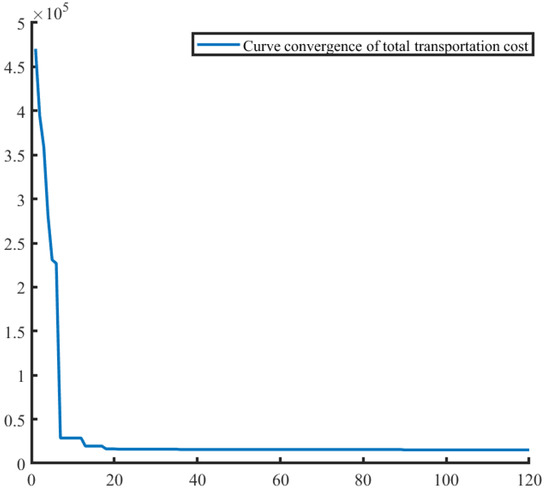 S7: The maximum termination algebra was set. After reaching the number of iterations, the optimal fitness individual was output, and the lowest total transportation cost scheme after decoding was obtained.