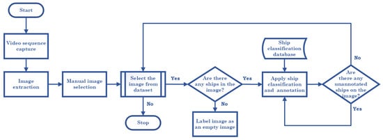 Therefore, this paper aims to fill this gap, i.e., a new dataset is presented to complement other available datasets for ship detection, classification, or algorithm performance estimation for passenger ports. The methodology presented in this paper is based on the work in [,,] and adapted for our application. Figure 1 shows the flowchart of the detailed dataset creation process used in this paper. The dataset creation process started with acquiring video sequences of real maritime traffic (explained in Section 2.3 and Section 2.4), followed by manual image extraction and selection (explained in Section 2.4). Afterward, the ships are annotated on the images and classified using a ship classification procedure described in Section 2.5 and Section 2.6. To the best of our best knowledge, no publicly available dataset covers this geographic location and maritime traffic profile.