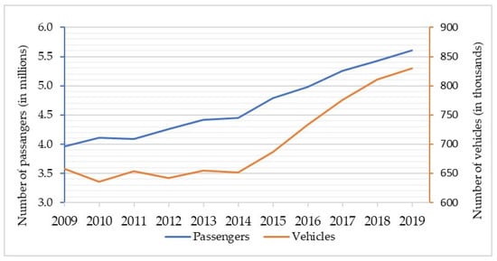 The city of Split is the economic and cultural center of the Croatian region of Dalmatia and the second largest city in the country. Due to its geographic location, proximity to the airport, and recent tourism growth, Split has also become an important transportation hub between the mainland and the islands. As shown in Figure 2, according to the Split Port Authority [], in 2009, 3,955,846 passengers and 657,871 vehicles were transported, while in 2019, 5,607,789 passengers and 829,594 vehicles were transported (disruption caused by the COVID-19 pandemic is ignored). In the above-mentioned ten-year period, the number of passengers increased by 42%, while the number of transported vehicles increased by 26%. This makes it the largest passenger port in Croatia and the third largest passenger port in the Mediterranean regarding the number of passengers and vehicles transported. These facts underline the importance of detailed maritime traffic monitoring for this port.