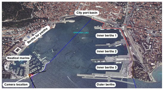 This port configuration ensures the diversity of maritime traffic since the port can accommodate different types of ships, as mentioned above. Most of these ships are not monitored by conventional maritime traffic monitoring systems. In order to monitor all maritime traffic entering and leaving the Port of Split, a long-range (LR) surveillance camera was procured as part of the project and mounted on the building overlooking the entrance to the port in January 2020. The location of the camera is shown as a red circle in Figure 3, while black lines depict the camera’s field of view. The camera coordinates are as follows: Latitude 43°30′04″ N, Longitude 16°25′48″ E, mounted 9 m above sea level.