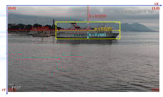 Additionally, in Figure 4, an example image from the proposed dataset is shown, in which the ship categorized as “Large Ferry” (Cat. ID 10 from Table 3) is annotated with the yellow BB, where X and Y are the normalized coordinates of the center of BB, and w and h are the normalized width and height of BB, respectively. After the image is annotated, a .txt file is created that contains all mentioned BB parameters. Then, a new line is created in the same .txt file for each annotated ship within an image. An example of the .txt file for the annotated ship from the image in Figure 4 is shown in Table 4. Within the proposed dataset, each image contains a .txt file with the same name as the image and is located in the same directory. Images without annotated ships contain an empty .txt file.