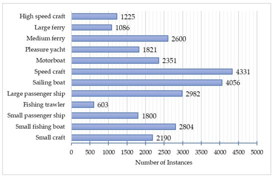 In this paper, we present the Split Port Ship Classification Dataset (SPSCD) for detecting ships in passenger ports. The proposed dataset consists of a total of 27,849 ship instances manually annotated with BB and classified as described above. The distribution histogram in Figure 5 shows the number of ship instances per class. In the proposed SPSCD dataset, the speed craft and sailing boat classes have a higher number of instances, while fishing trawlers have a lower number of instances. This is due to the nature of the maritime traffic profile in the Port of Split: fishing trawlers are not common in passenger ports, while speed crafts and sailing boats are very common, especially during the summer. Intra-class variability also affects the number of instances per class, as for example, speed crafts can come in different models and colors, different types of propulsion (the outboard engine may be clearly visible on board), etc., while classes such as high-speed craft or large ferry have lower intra-class variability.