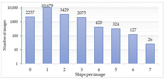 One of the parameters in image datasets is the information about how many objects are on the images at the same time. The distribution of ships per image of the SPSDC dataset is shown in Figure 6, where 10,679 images contain one ship, while the rest contain between two and seven ships. Of the total 19,337 images, 2257 images contain no ships, or 11.7%. This is a good balance between images with ships and empty images, which is important for the performance estimation of algorithms or DCNN models.