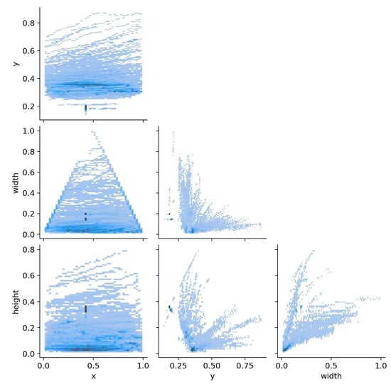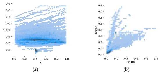 Figure 7a shows the distribution of positions of all annotations, where x and y are normalized coordinates of the center of BB. As described in Section 2.6, the annotation format sets the starting point (0,0) of the image in the upper left corner, which means that on the plot, the starting point of the images is in the lower left corner. Each scatters plot represents the annotation position, while the blue color range (from light blue to dark blue) represents the concentration of the annotation position.