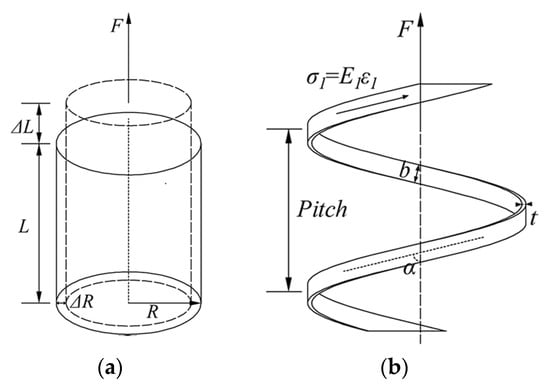 As shown in Figure 5a, for the spiral belt with helix angle , the geometric relationship between the strain along the fiber and axial directions of the pipe can be expressed as follows: