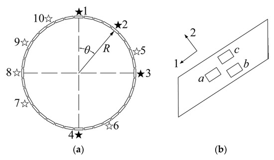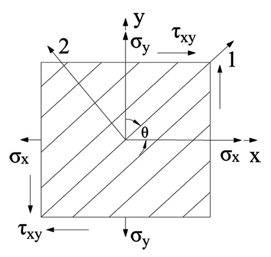 However, the local coordinate system (i.e., 1–2) of the lamina is different from the global coordinate system (i.e., x–y) of the structure, and the angle between the 1-axis (the fiber direction of the material) and x-axis (the axis direction of the structure) is (anticlockwise implies positive direction), as shown in Figure 3. A coordinate transformation is required to obtain the off-axis engineering constants. The expansion of the transformation matrix is expressed as: