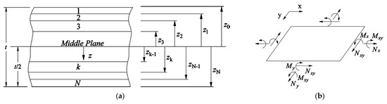 Laminate structure. (a) Plies of laminate and z-coordinate of laminas; (b) internal forces and moments of laminate in the plane stress state.