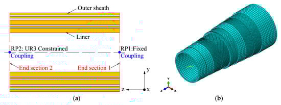 Finite element model of glass fiber-reinforced flexible pipe. (a) Couplings and boundary conditions; (b) meshes of the model.