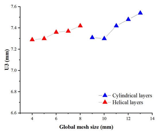 Structured meshes were employed for the cylindrical layers, while swept meshes were adopted along the helix direction for the helical layers. Mesh size sensitivity analyses were performed to determine the mesh sizes of different layers. In the first set of models, the initial global mesh sizes of the cylindrical layers were set as 10 mm, and those of helical layers were set as 8, 7, 6, 5 and 4 mm, respectively. In the second set of models, the initial global mesh sizes of the helical layers were set as 5 mm, and those of the cylindrical layers were set as 13, 12, 11, 10 and 9 mm, respectively. Figure 7 illustrates the results of axial displacements obtained by different models. According to the results, the global mesh sizes of the cylindrical and helical layers were set as 10 and 5 mm, respectively. The mesh numbers along the circumferential and thickness directions of L1 were set as 50 and 2, respectively. The mesh numbers along the circumferential and thickness directions of L9 were set as 70 and 2, respectively. The mesh numbers along the transverse and thickness directions of the spiral belts of L5 were set as 50 and 2, respectively. The mesh number along the transverse direction of each spiral belt of the tensile reinforcement layers was set as 4. To avoid the effect of excessive deformation on the analysis, the C3D8R element was adopted for all parts of the model, and the enhanced hourglass control mode was selected to limit the hourglass expansion. The entire model comprised 622,928 elements and 1332,258 nodes, as shown in Figure 6b.