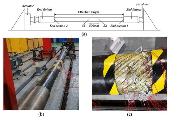 The sample was connected to a horizontal tensile-testing machine. One end was completely fixed on the support of the machine, and the other end was connected to a hydraulic actuator with restricted axial torsion. Two sections of the sample, S1 and S2, were selected to monitor the strain; here, S1 was the midspan section, S2 was located between S1 and the fixed end, and the distance between S1 and S2 is 500 mm, as shown in Figure 8a,b. S1 was the main section for the measurement of fiber-direction strains of spiral belts, and S2 was selected for comparative analysis. A section of the outer sheath with a width of 15 cm was removed from S1 and S2; thus, the spiral belts of the outer tensile reinforcement layer were exposed. Additionally, strain gauges were attached, as shown in Figure 8c.