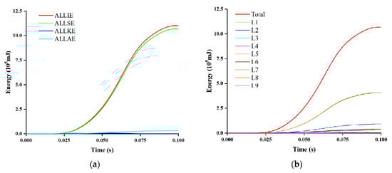 Energy history curves of finite element model. (a) Comparisons of different energy; (b) comparisons of strain energy of different layers.