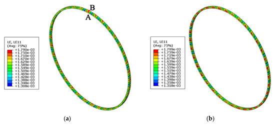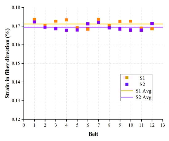 For the spiral belt at the 0° position along the circumferential direction of S1, the fiber-direction strain was obtained by averaging the fiber-direction strains of Points A and B (as shown in Figure 10a) at the middle position of the spiral belt. In Section S1, one spiral belt was selected from every three spiral belts along the circumferential direction from the 0° position to extract the strain data; thus, the fiber-direction strains of 12 spiral belts were obtained. Similarly, the fiber-direction strains of the 12 spiral belts selected in S2 were obtained. The average values of the fiber-direction strain of the spiral belts in S1 and S2 are 0.1712% and 0.1695%, respectively, as shown in Figure 12.