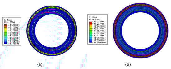 For the fiber-reinforced flexible pipe used in this study, the liner, inner hoop layer, membrane, and outer sheath were modeled as cylindrical structures, whereas the inner and outer tensile reinforcement layers and hoop reinforcement layer were modeled as helical structures. The stresses and deformations of the layers under axial tensile loading are shown in Figure 2.