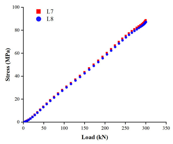 Figure 16 illustrates the distribution of the fiber-direction stress at different positions in the outer tensile spiral layer (Layer L7). As shown in the figure, the stress distributions of the two sections are similar to those of the corresponding sections of Layer L8. The same method as described in Section 3.2 was employed to calculate the mean fiber-direction stress of 12 spiral belts at the midspan section of Layers L8 and L7. The relationships between the mean fiber-direction stress and axial tensile load are shown in Figure 17. The figure illustrates that, as the axial tensile load increases, the mean fiber-direction stresses of the spiral belts increase approximately linearly. When the axial tensile load reaches 300 kN, the fiber-direction stresses of Layer L7 and L8 are 88.57 and 87.19 MPa, respectively. The stress of Layer L7 is slightly higher than that of Layer L8, indicating that Layer L7 contributes more to the axial load capacity than Layer L8, which is similar to the conclusion presented in Section 3.1.