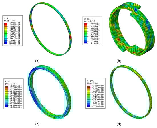 Figure 18 illustrates the stress distribution in the midspan sections of the different layers. The inner hoop layer was subjected to compressive stress along the fiber direction, and the maximum and minimum values of the fiber-direction stress at the midspan section are 20.8 and 18.3 MPa, respectively (see Figure 18a). Similarly, the hoop reinforcement layer was subjected to compressive stress along the fiber direction, and the maximum and minimum values of the fiber-direction stress at the midspan section are 18.1 and 13.8 MPa, respectively (see Figure 18b). The inner hoop and hoop reinforcement layers are the main carriers of radial load, and their filament winding angles are 80° and 86°, respectively, which are close to the circumferential direction of the pipe; thus the compressive stress along the fiber direction reflects the radial compression of the pipe under axial tensile load. The maximum axial stress at the midspan section of the liner and outer sheath are 2.99 and 3.37 MPa, respectively (see Figure 18c,d), which indicates that the contributions of the two layers to the axial load capacity are limited.